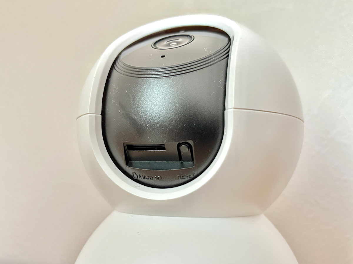 カメラの角度を手で上まで上げると、MicroSDカードスロットと、リセットボタンがあります。
