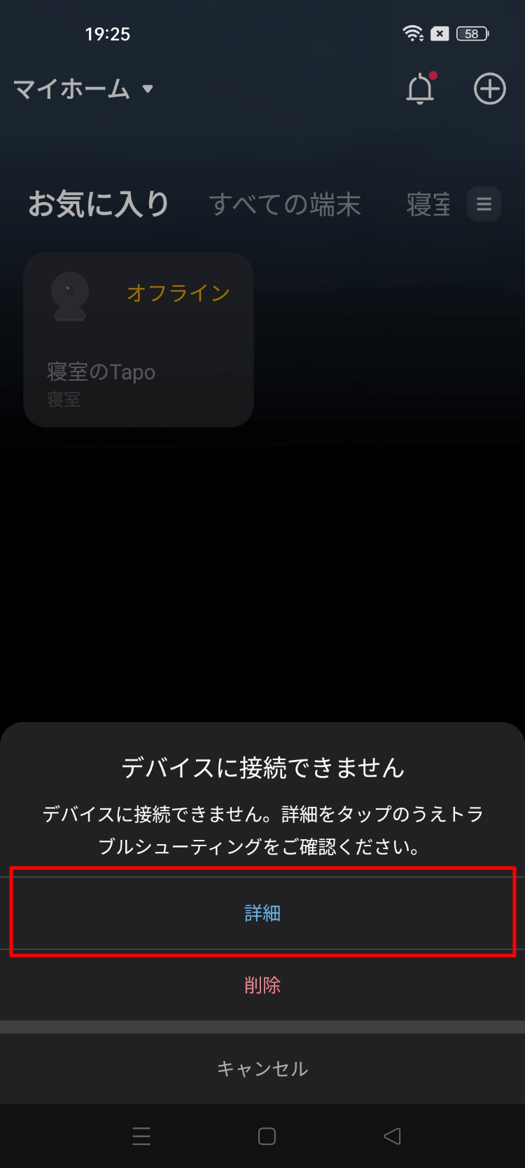 「デバイスに接続できません」と出るので「詳細」をタップ