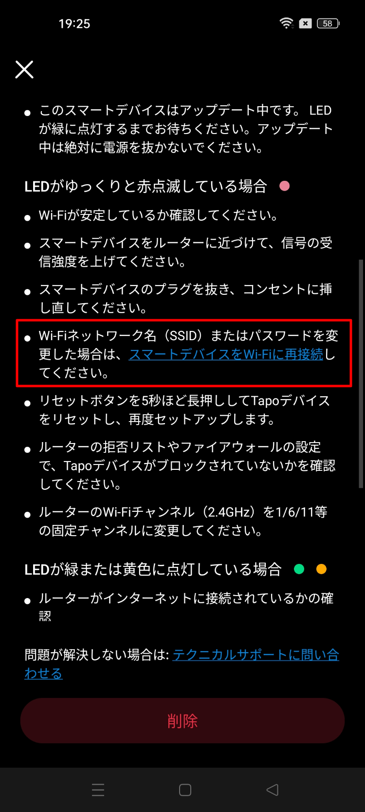今は赤点滅のはずなので「LEDが赤と緑に点滅していない?」をタップ