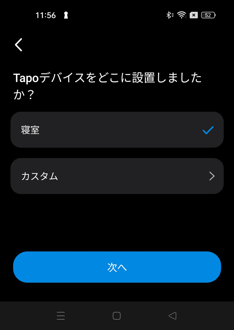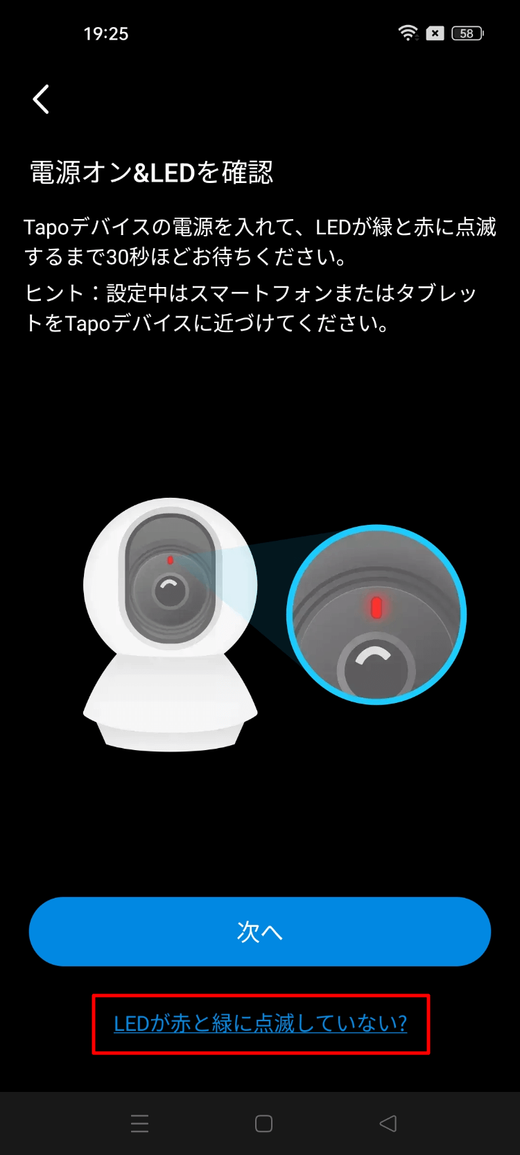 先ほどの画面に戻るので、Tapoが緑と赤に点滅していることを確認し「次へ」をタップします。