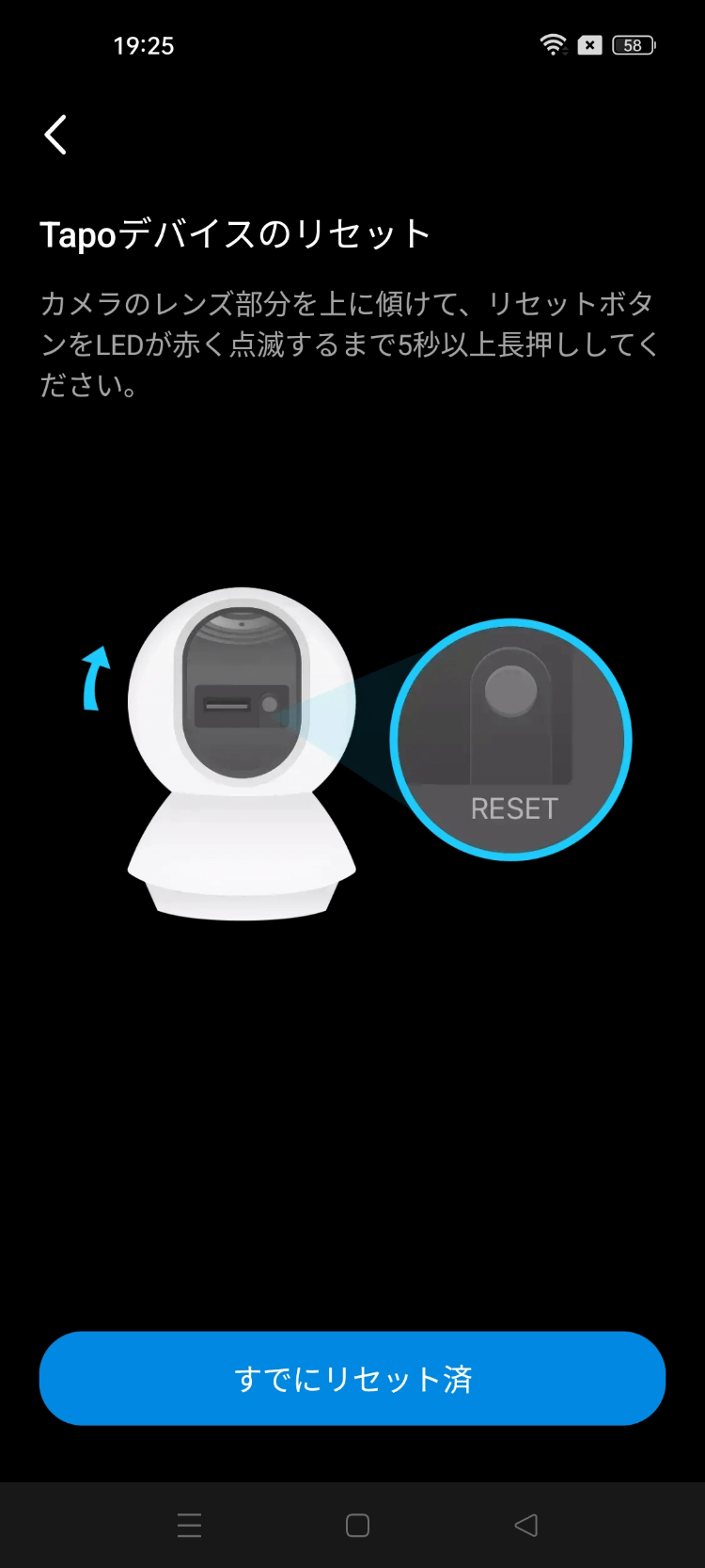 Tapoを上に手で押し上げ、リセットボタンを5秒押します。