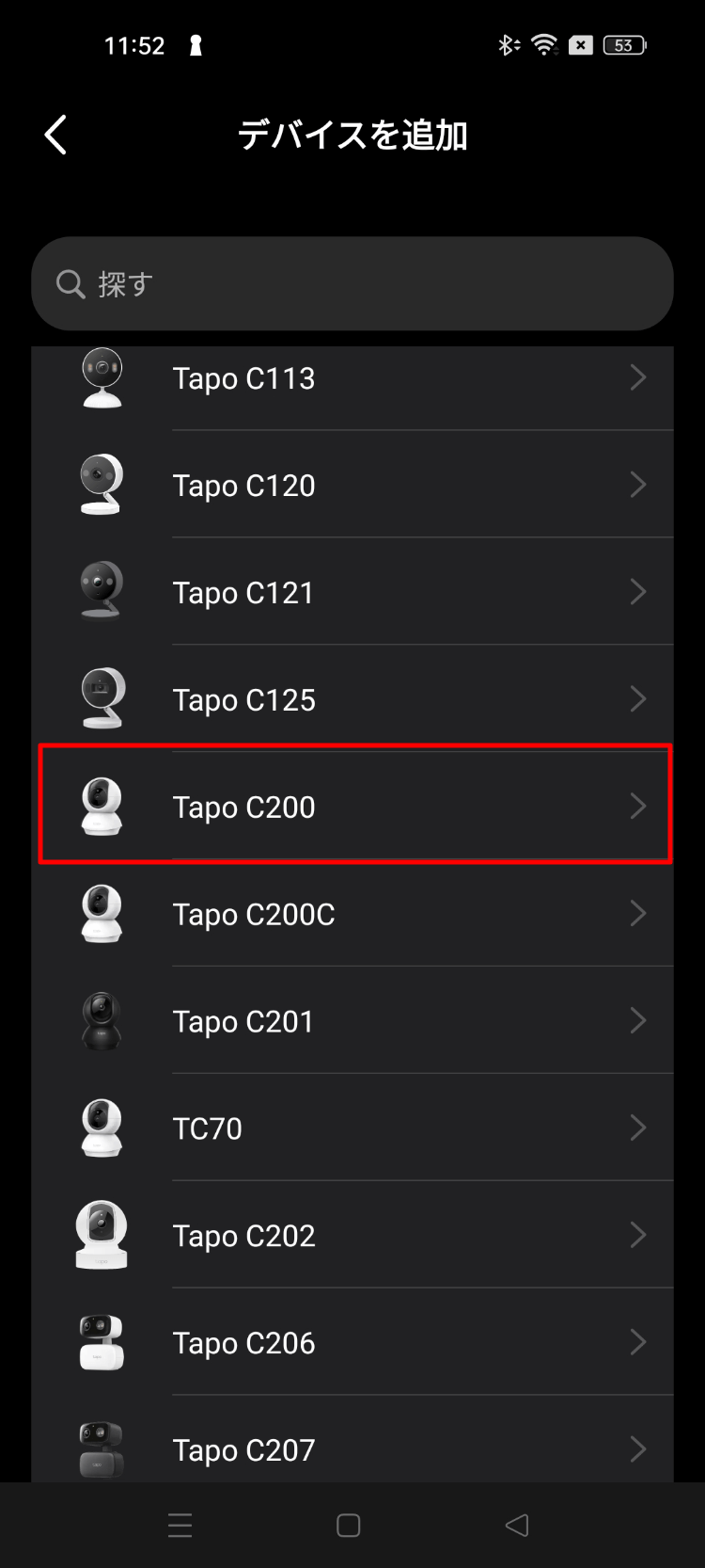 「Tapo C200」を選択します。 (買った機種に合わせてください)