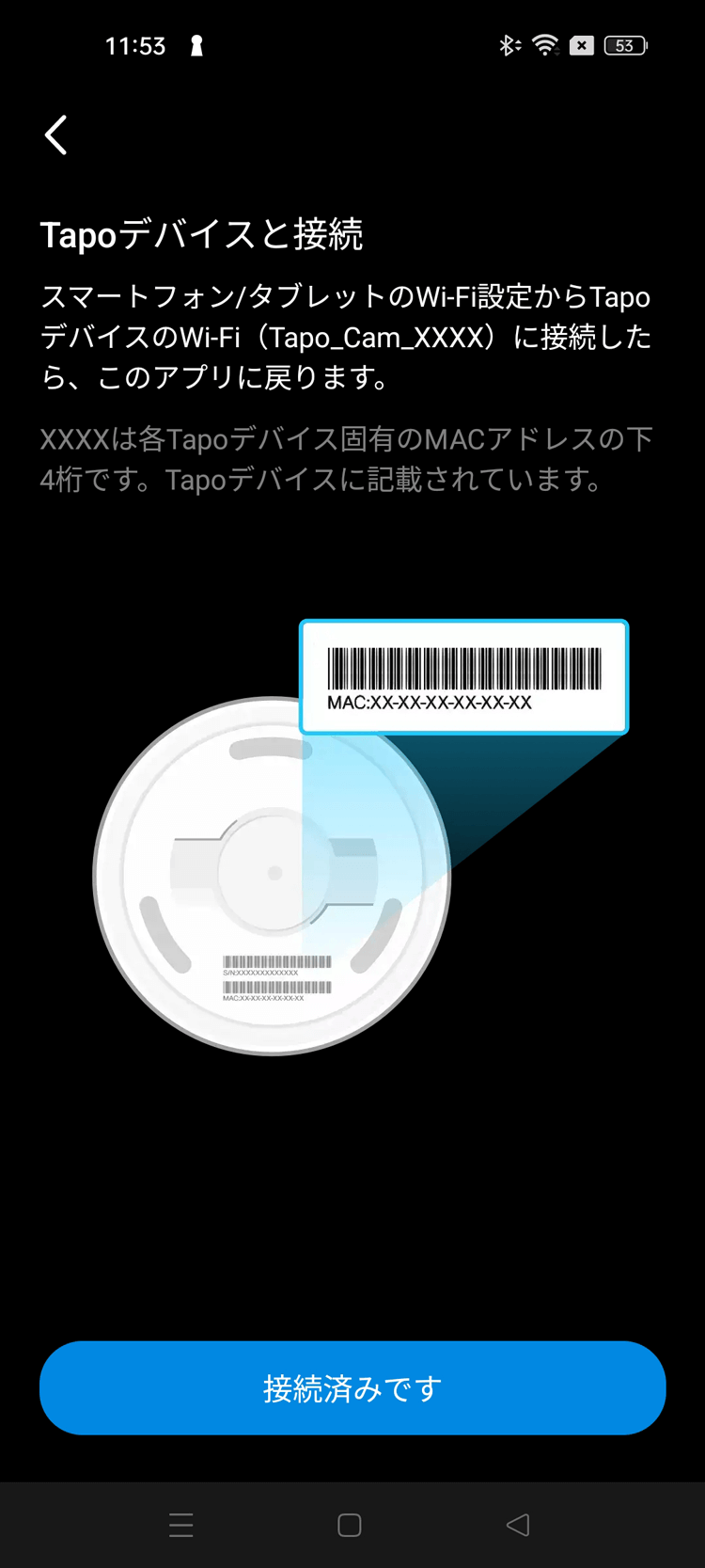 Tapoアプリに戻り「接続済みです」をタップします。