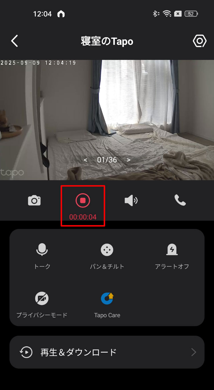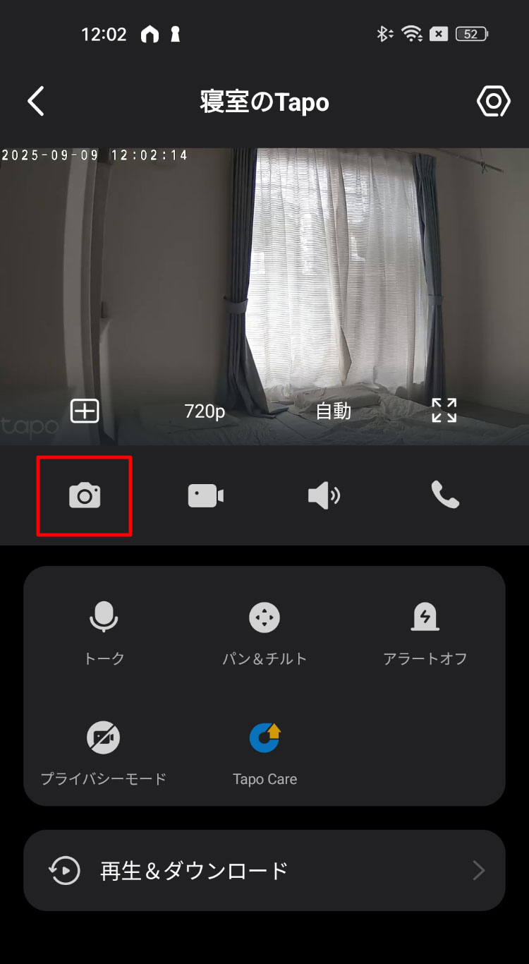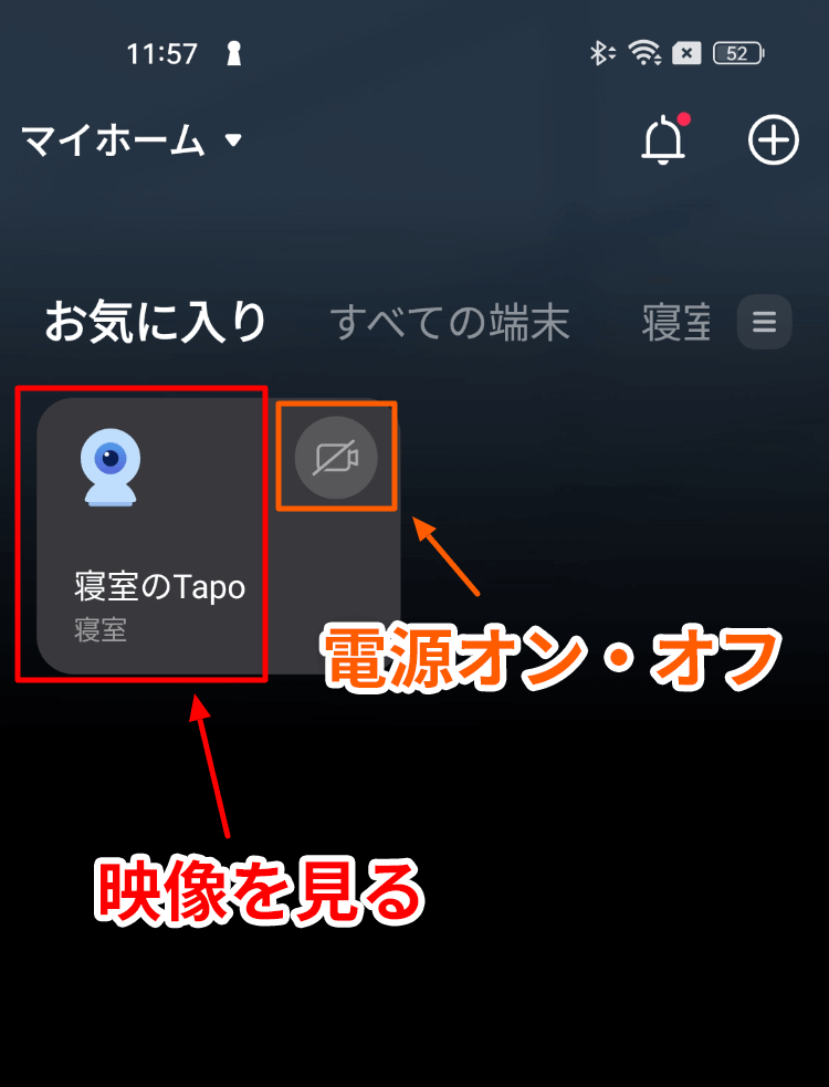 赤枠をタップすると映像を見ることができ、オレンジ枠をタップするとカメラのオン・オフを切り替えることができます。