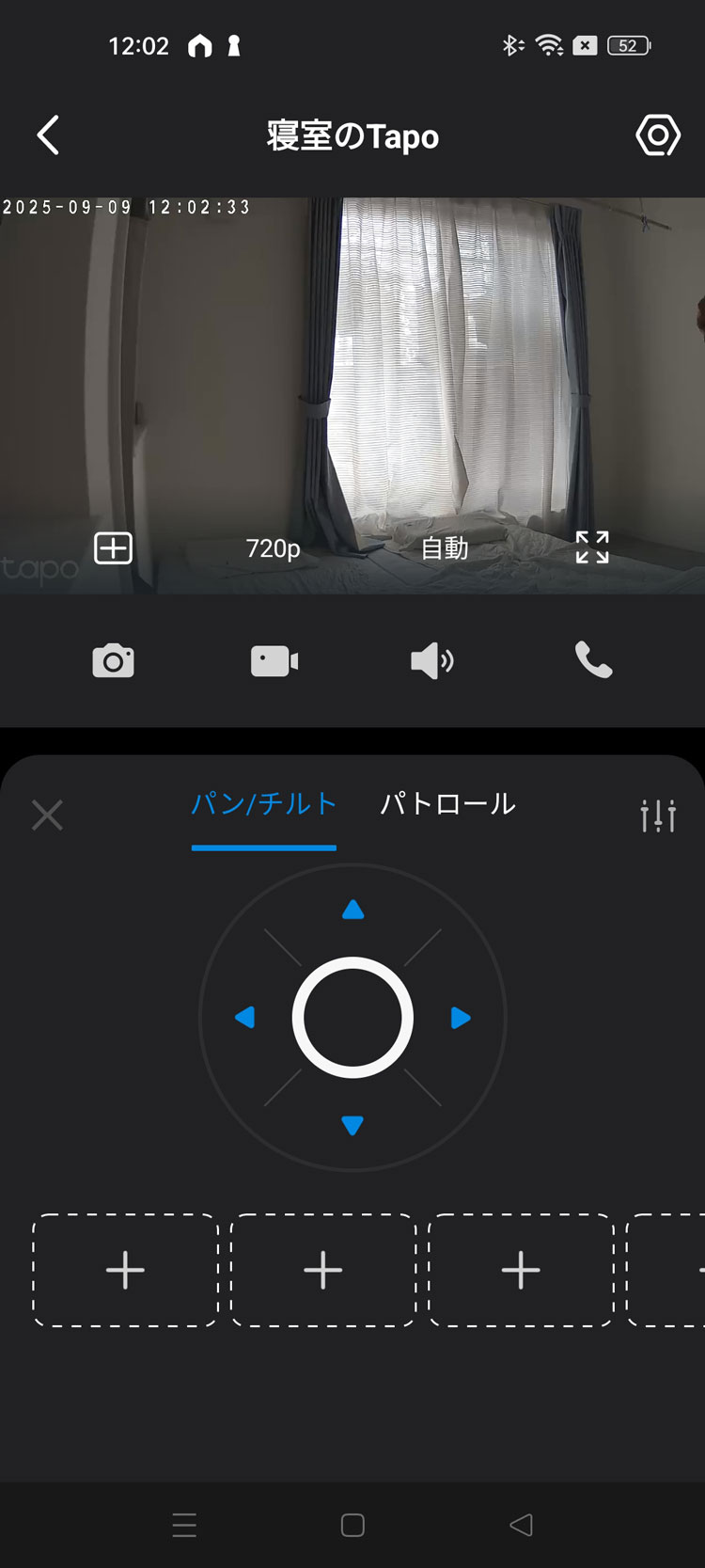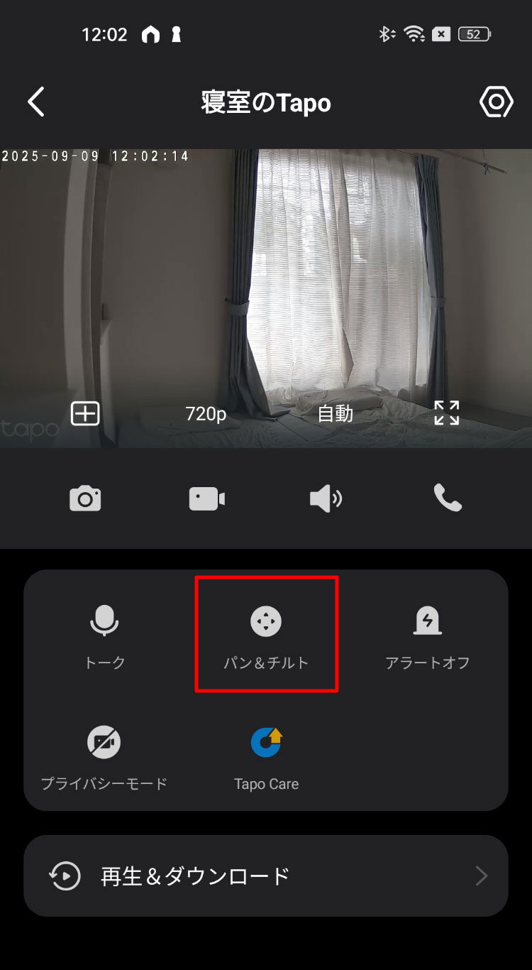 まずは「パン&チルト」をタップすると、カメラの角度を調整することができます。