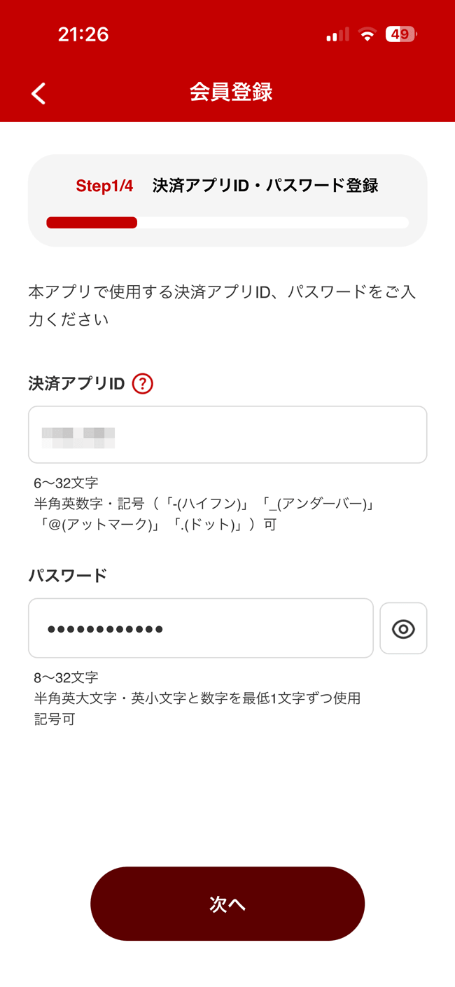 「決済アプリID」と「パスワード」を設定して「次へ」