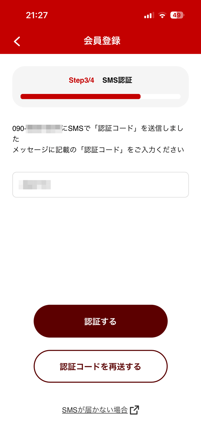 次の画面で電話番号を入力し、認証コードを入力します。