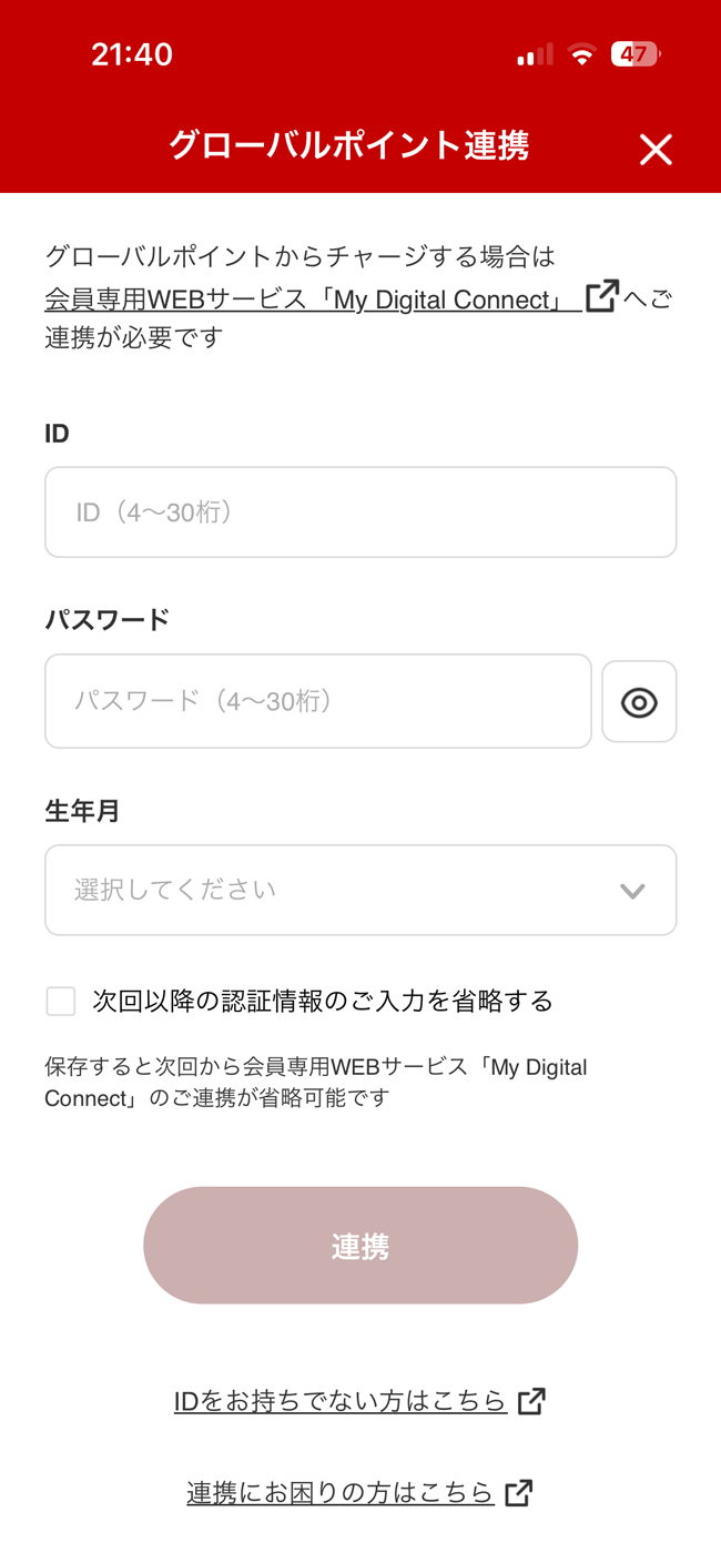 (先ほど登録したグローバルポイント WalletのIDとパスワードではないので注意してください)
