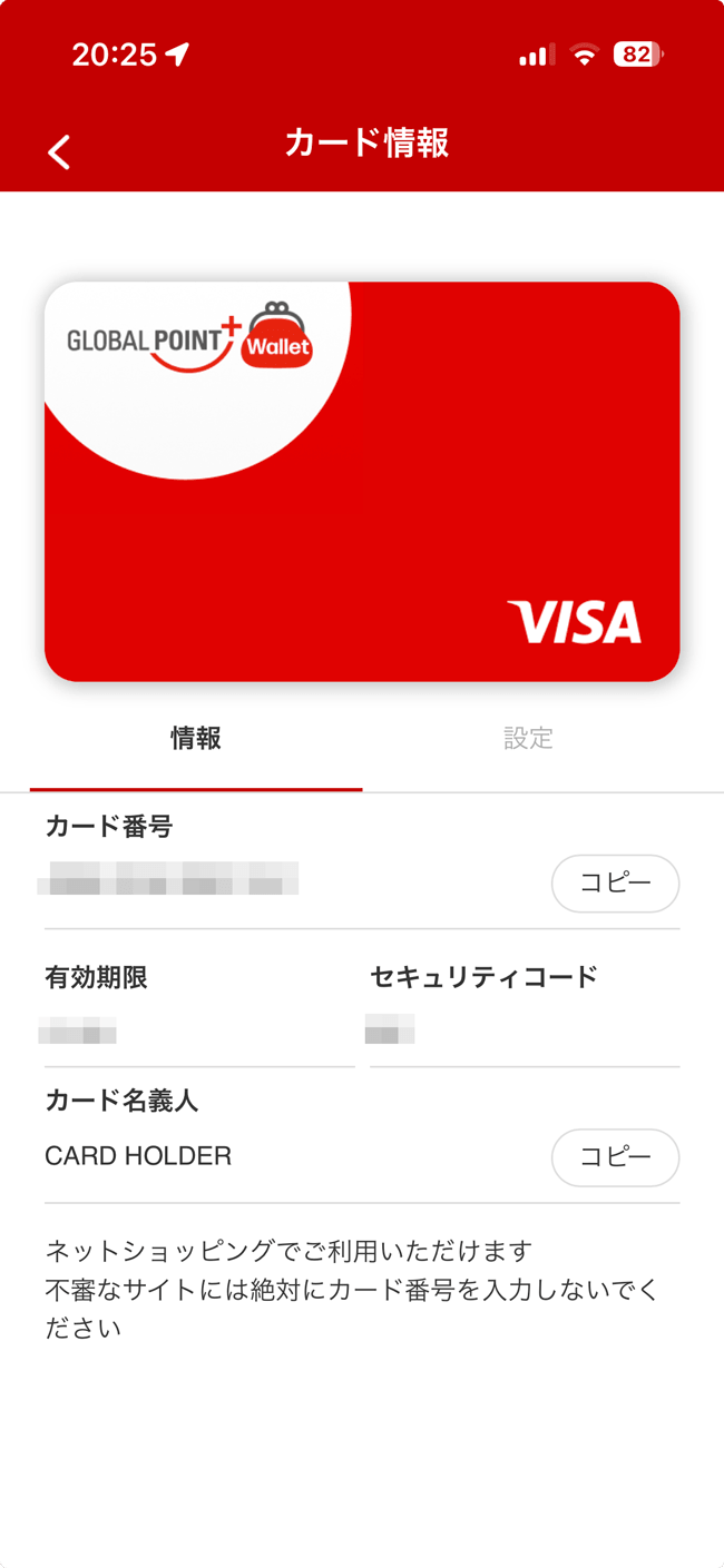 バーチャルカードの「カード番号」「有効期限」「セキュリティコード」「カード名義人」を確認することができます。